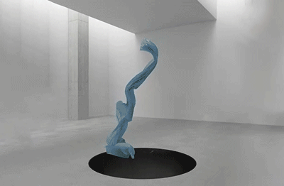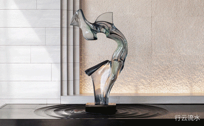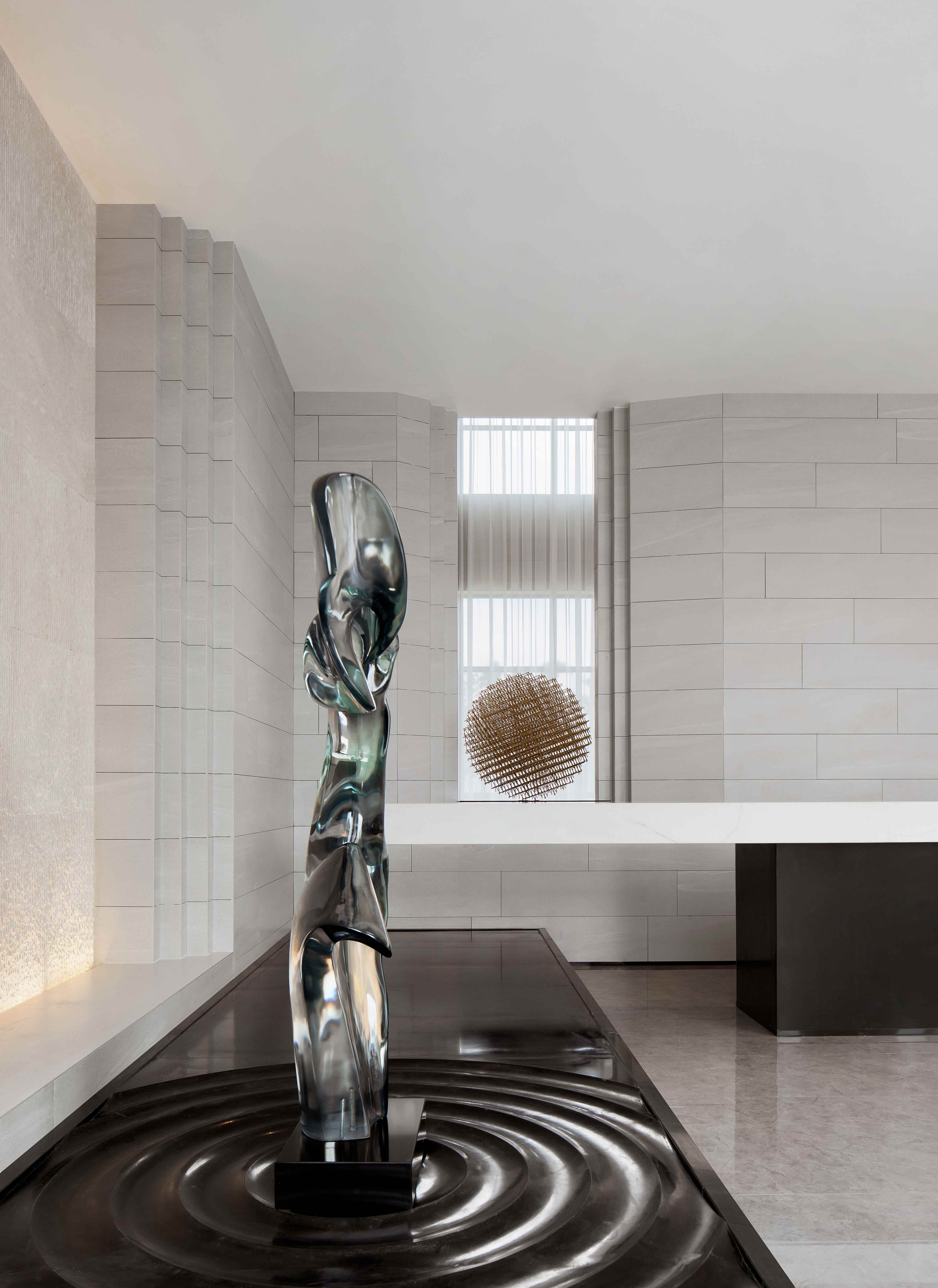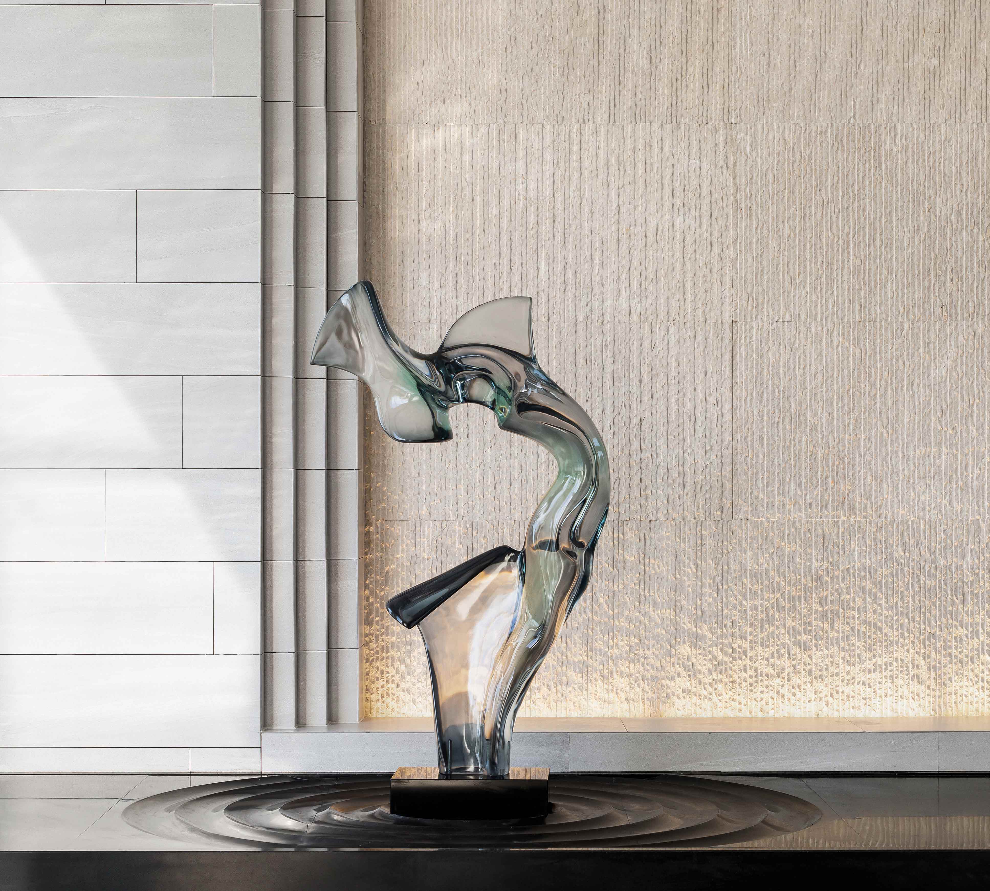 动线转换之间予以柔和,玻璃雕塑将曲折有机形态与空间几何肌理糅合,