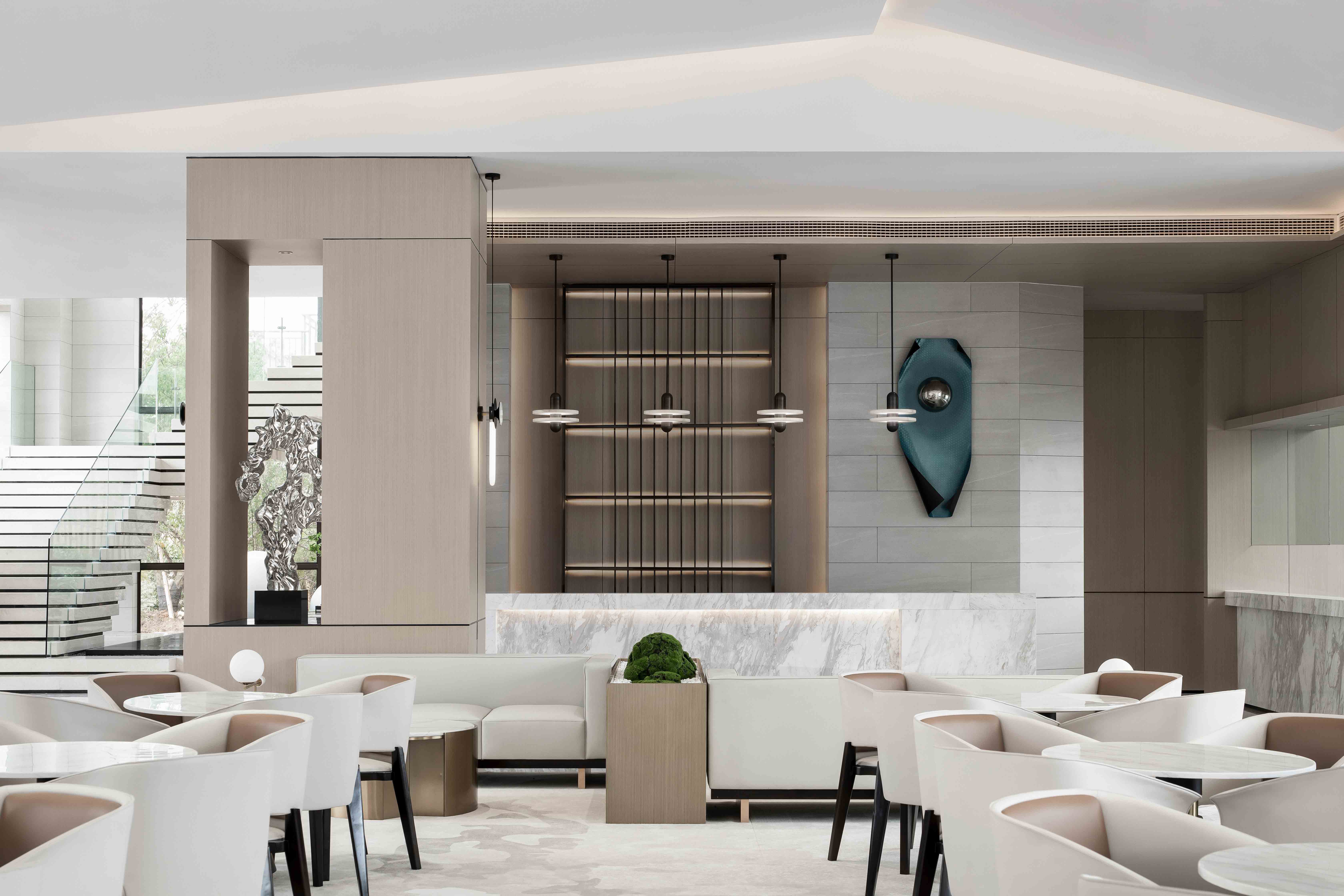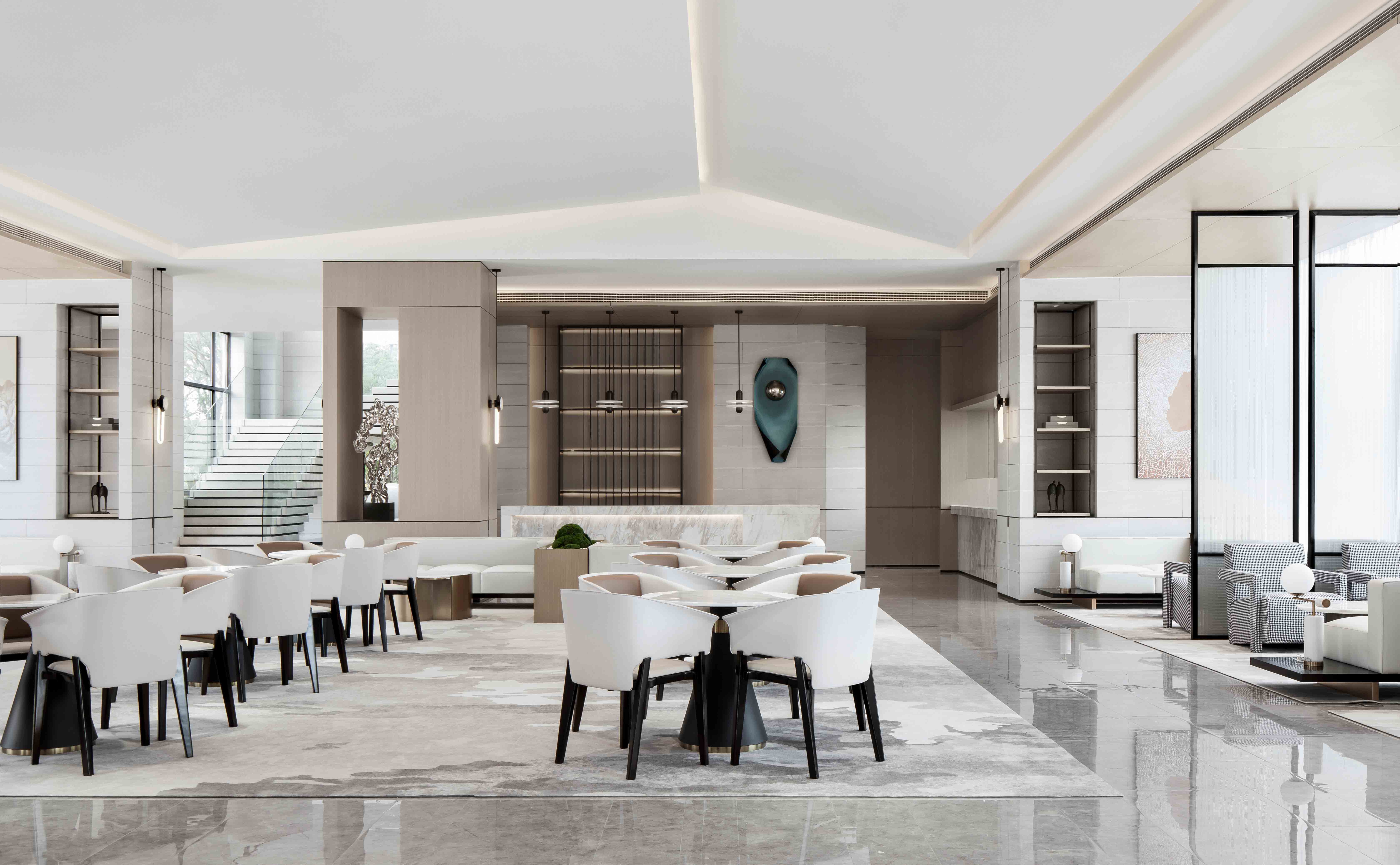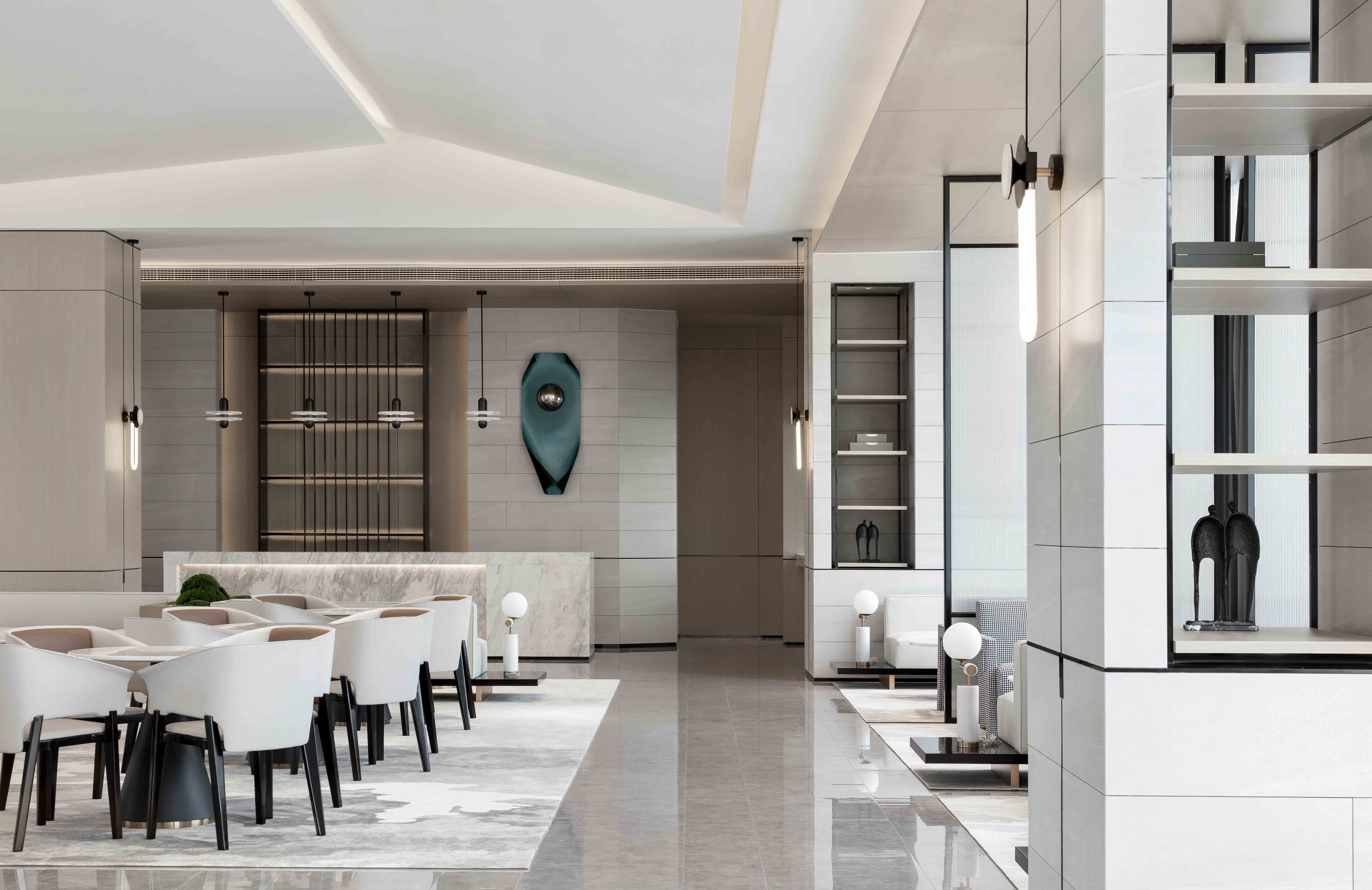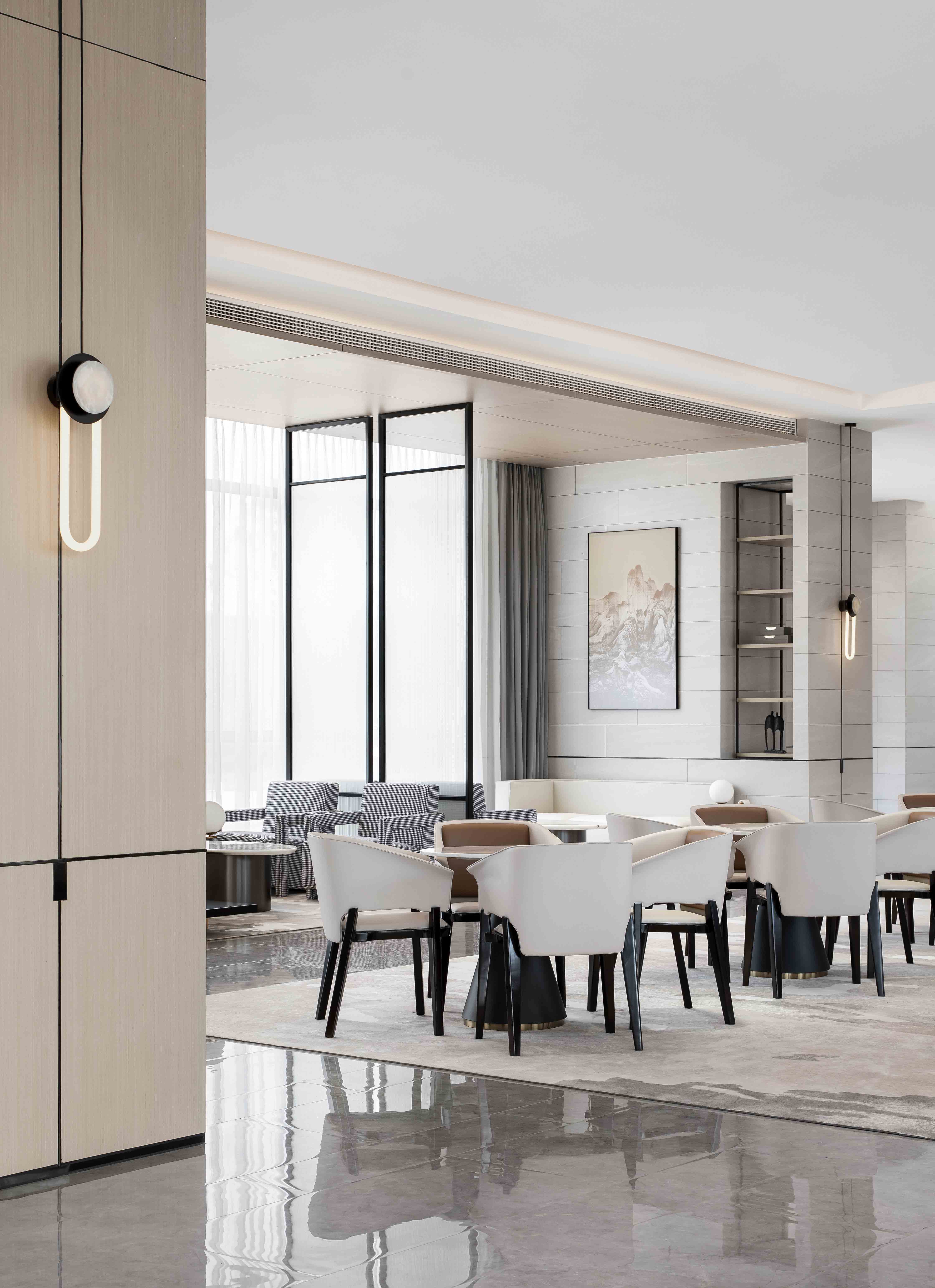 洽谈区天花的坡面将不平衡动态观感极致呈现,以现代方式重构传统秩序美。
