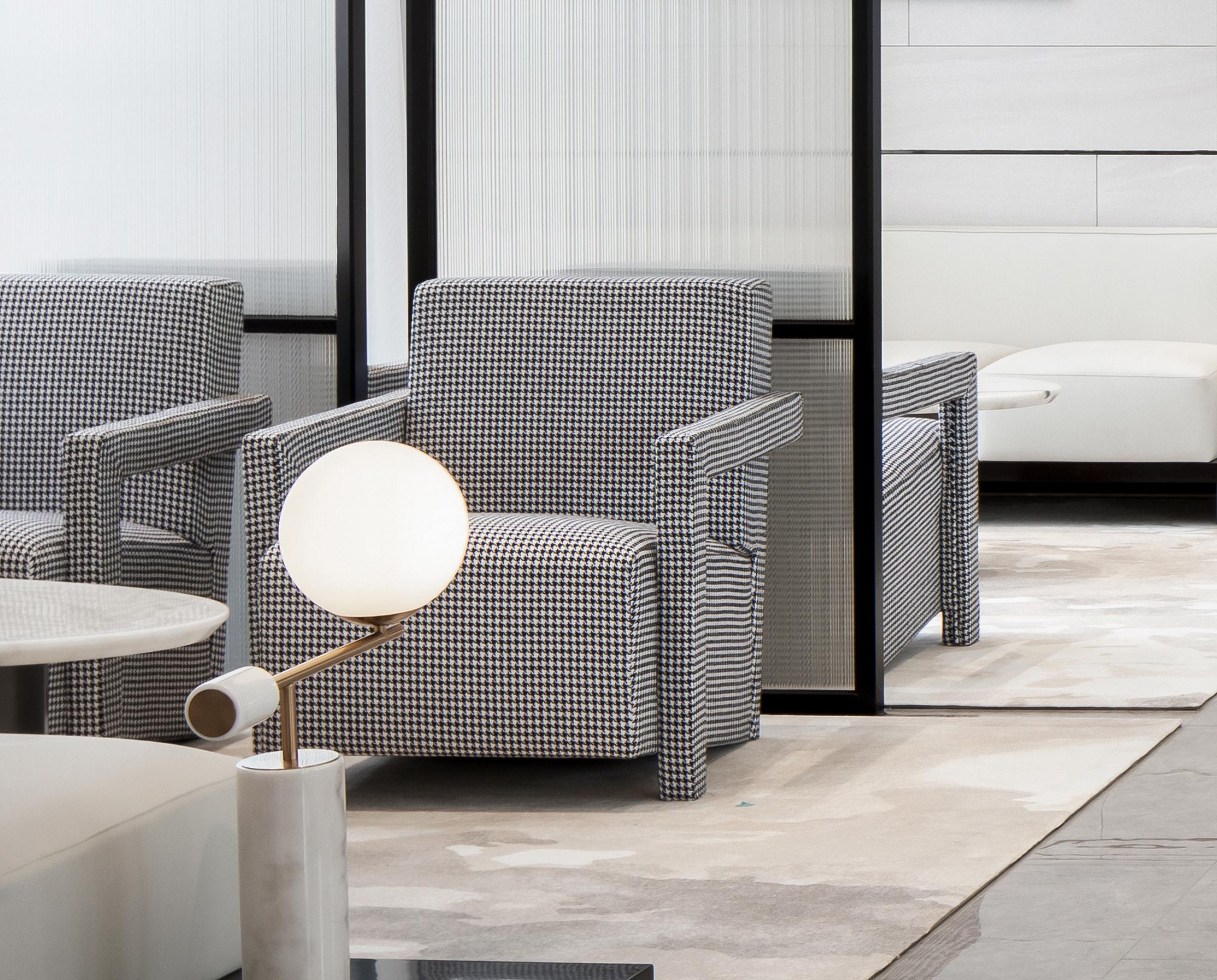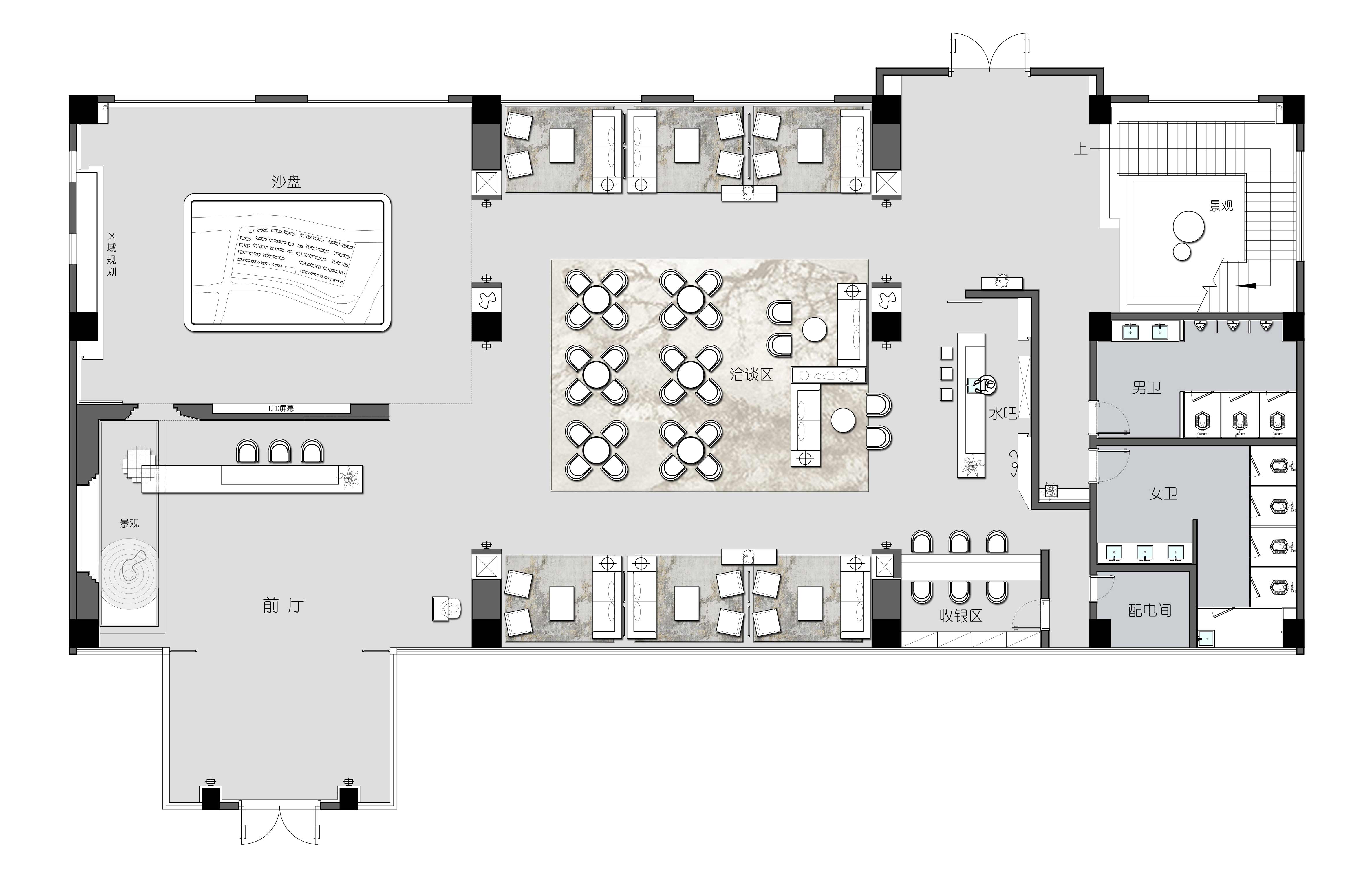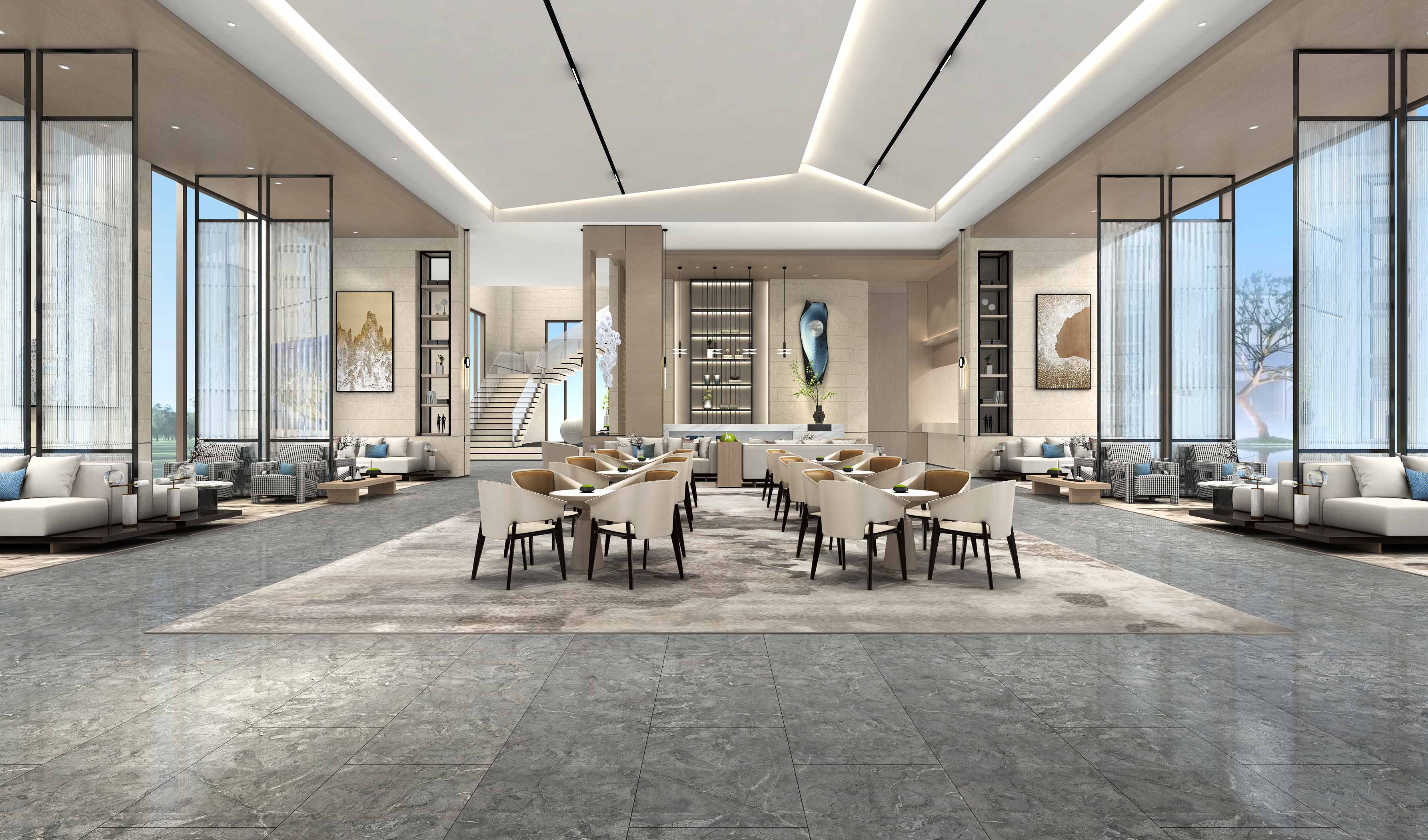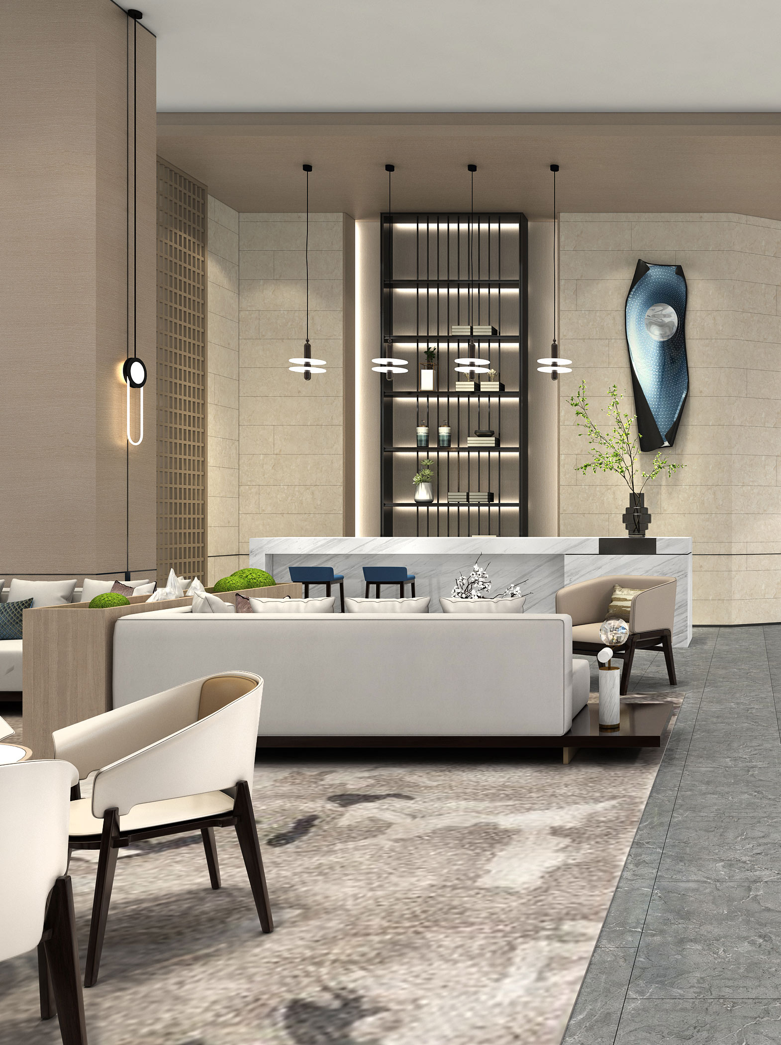 洽谈区天花的坡面将不平衡动态观感极致呈现,以现代方式重构传统秩序美。