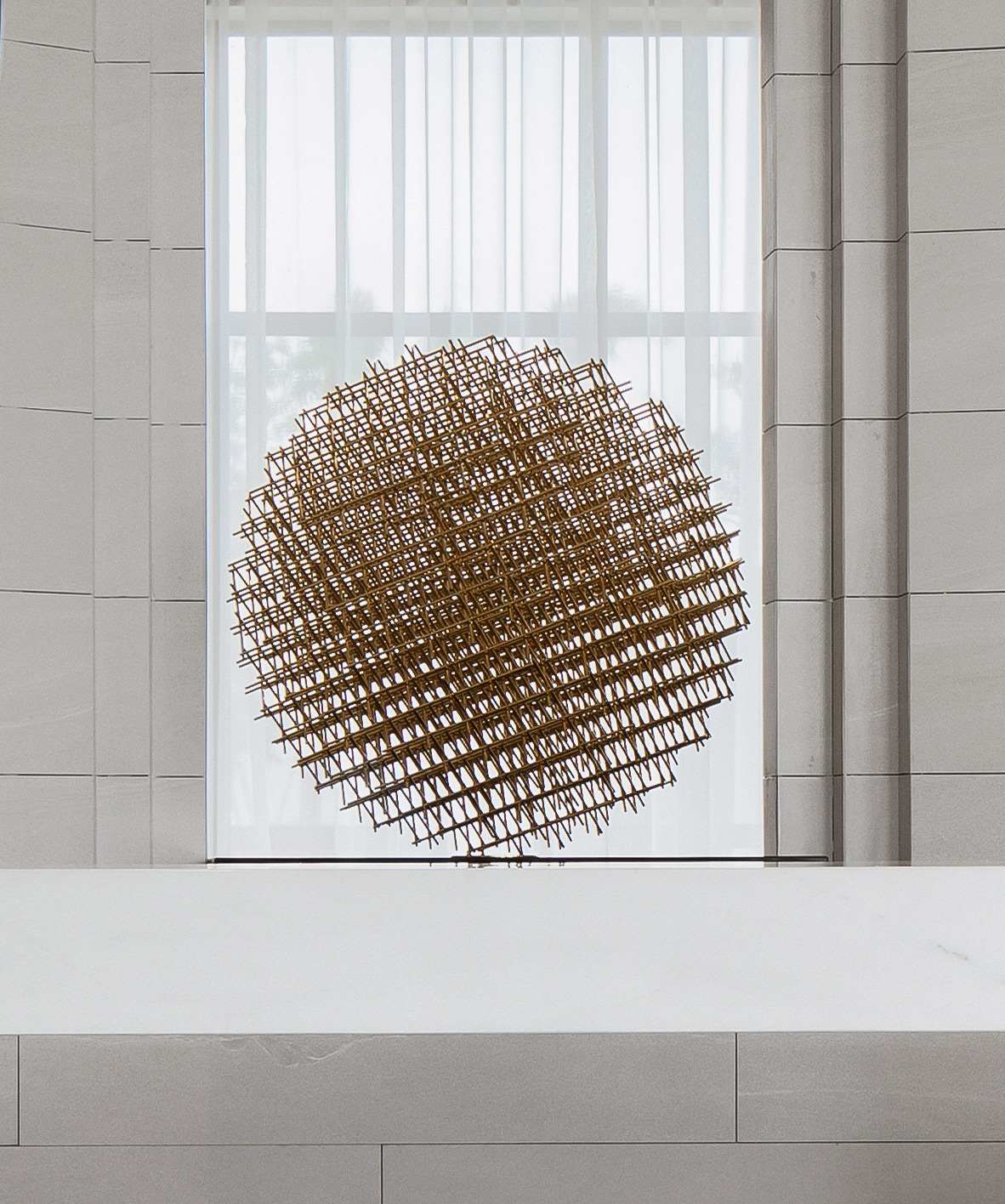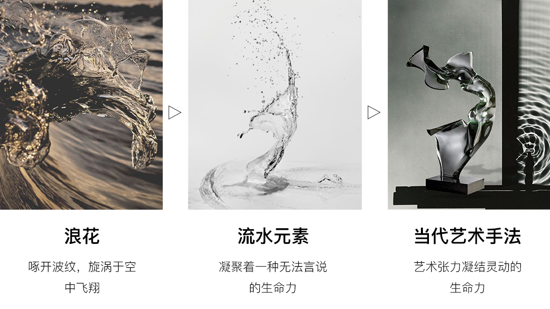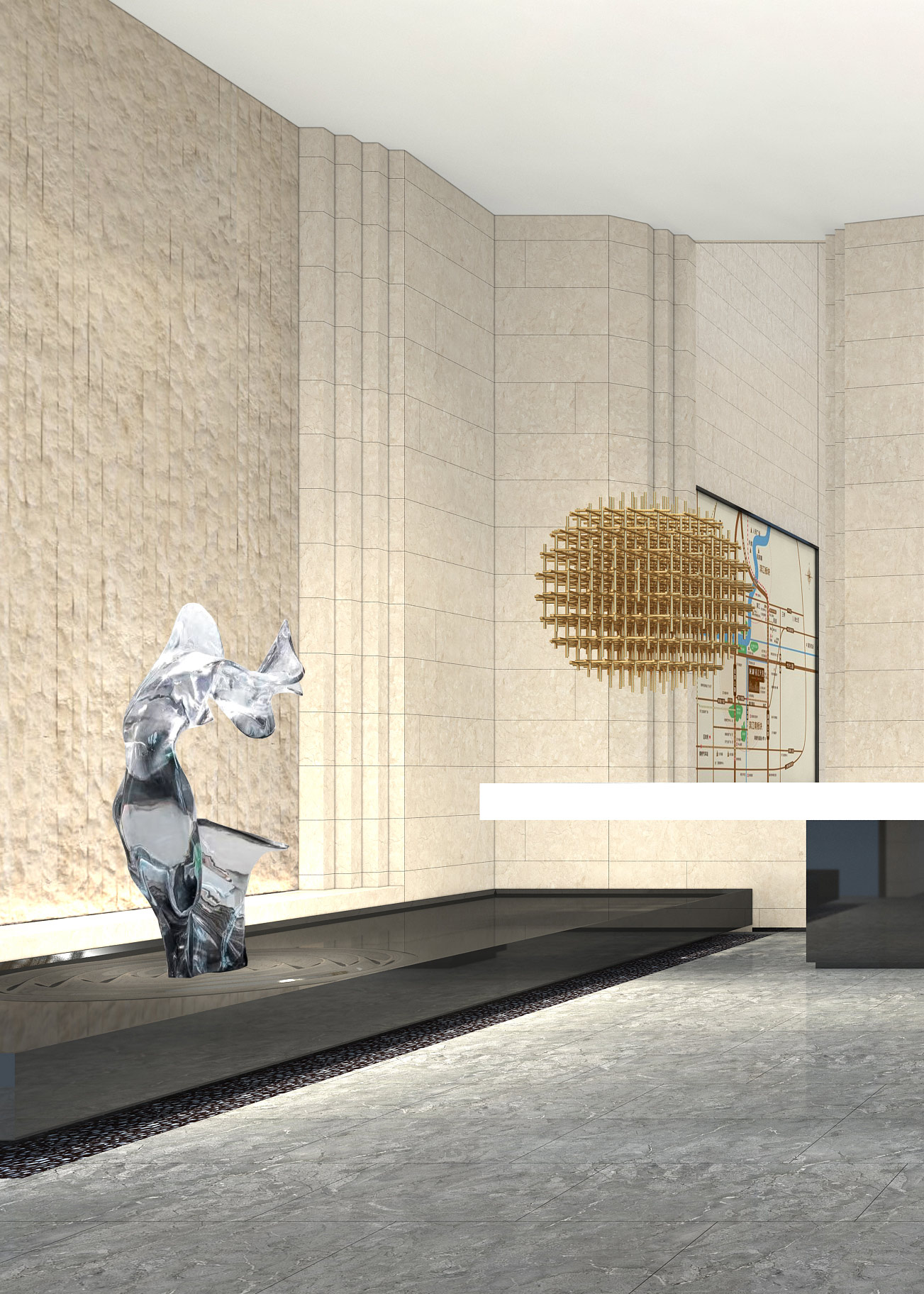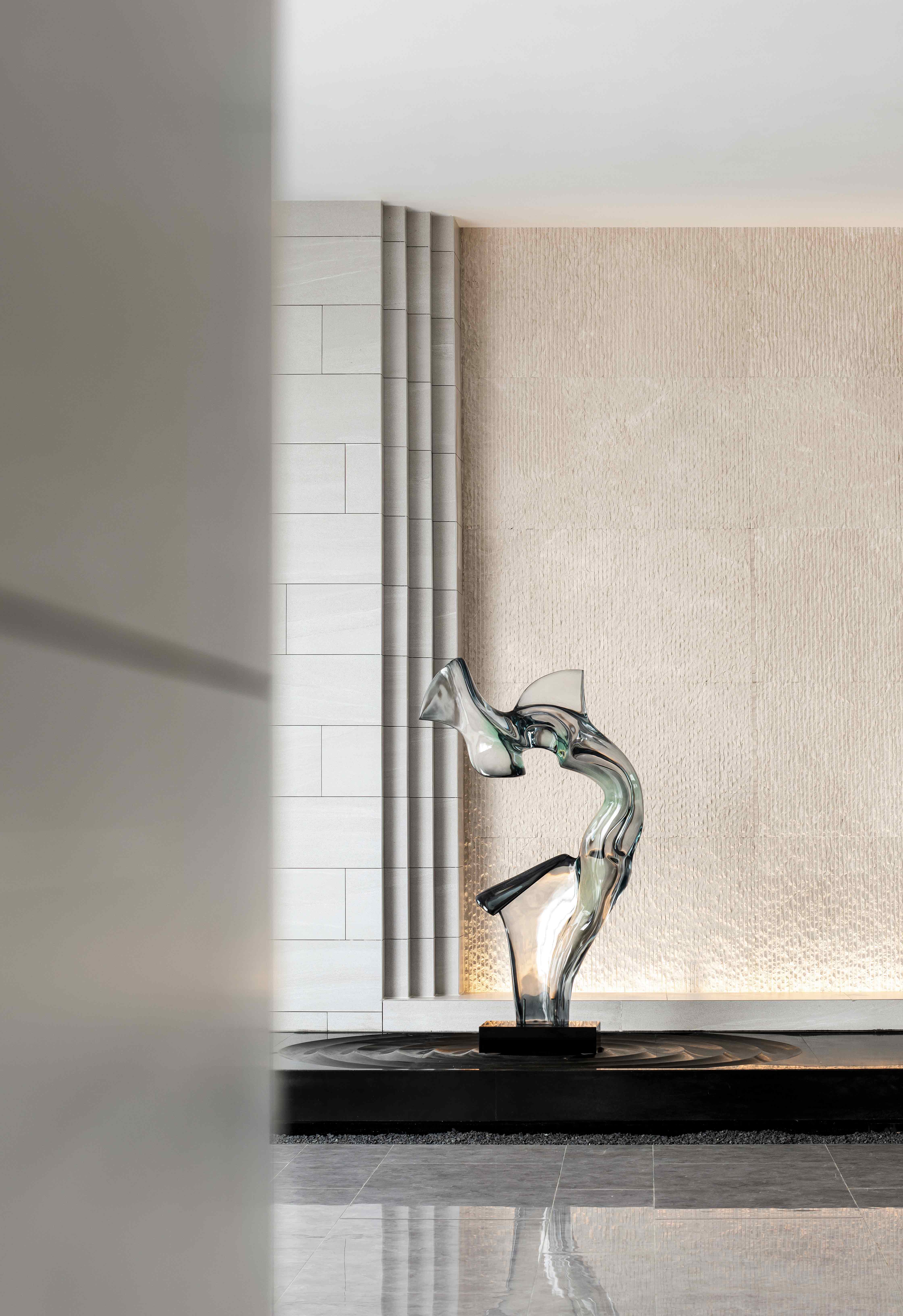 动线转换之间予以柔和,玻璃雕塑将曲折有机形态与空间几何肌理糅合,
