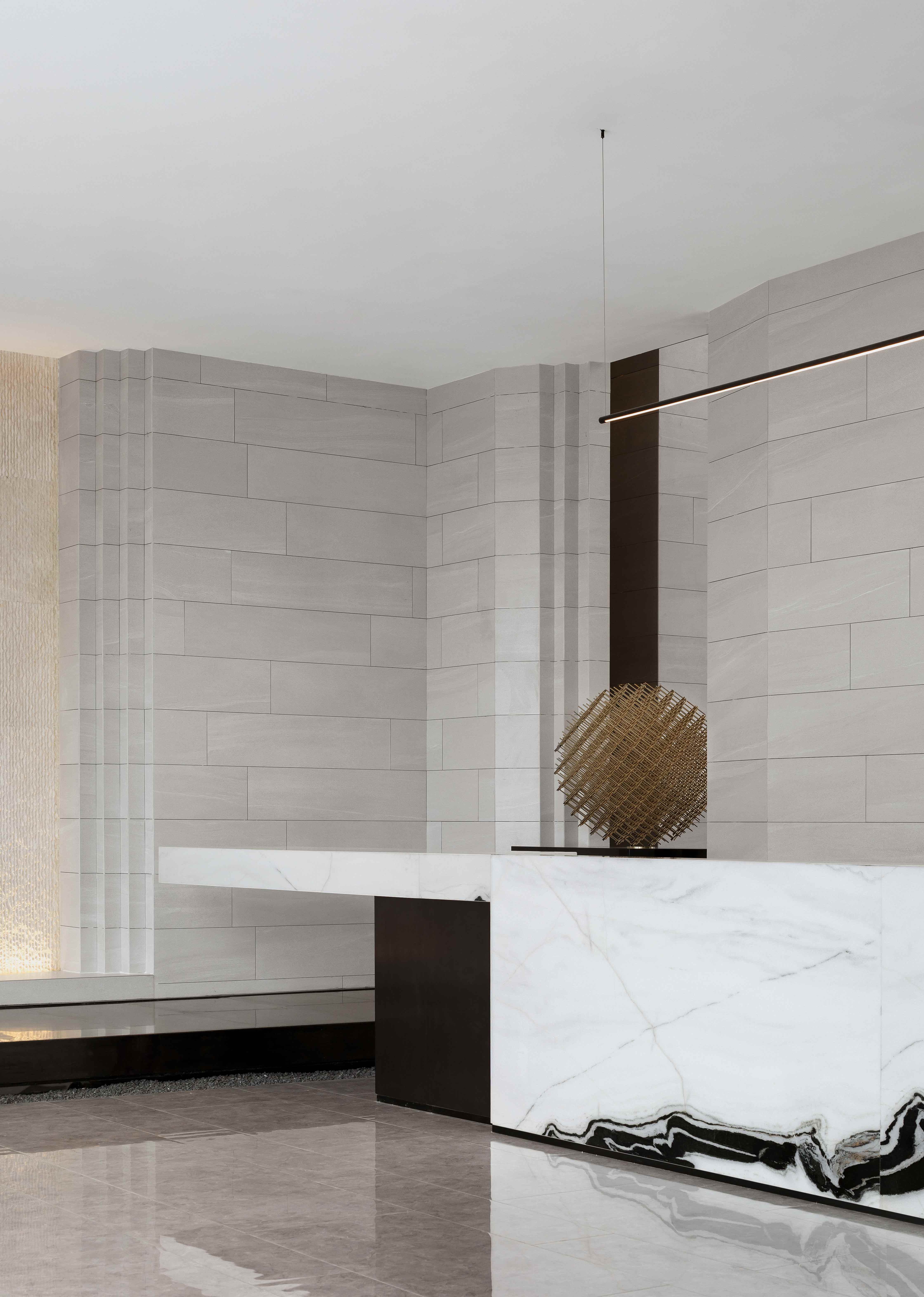 随着空间的节奏舒缓,石材以利落的线条划分棱角,目光所及,素色如锦。