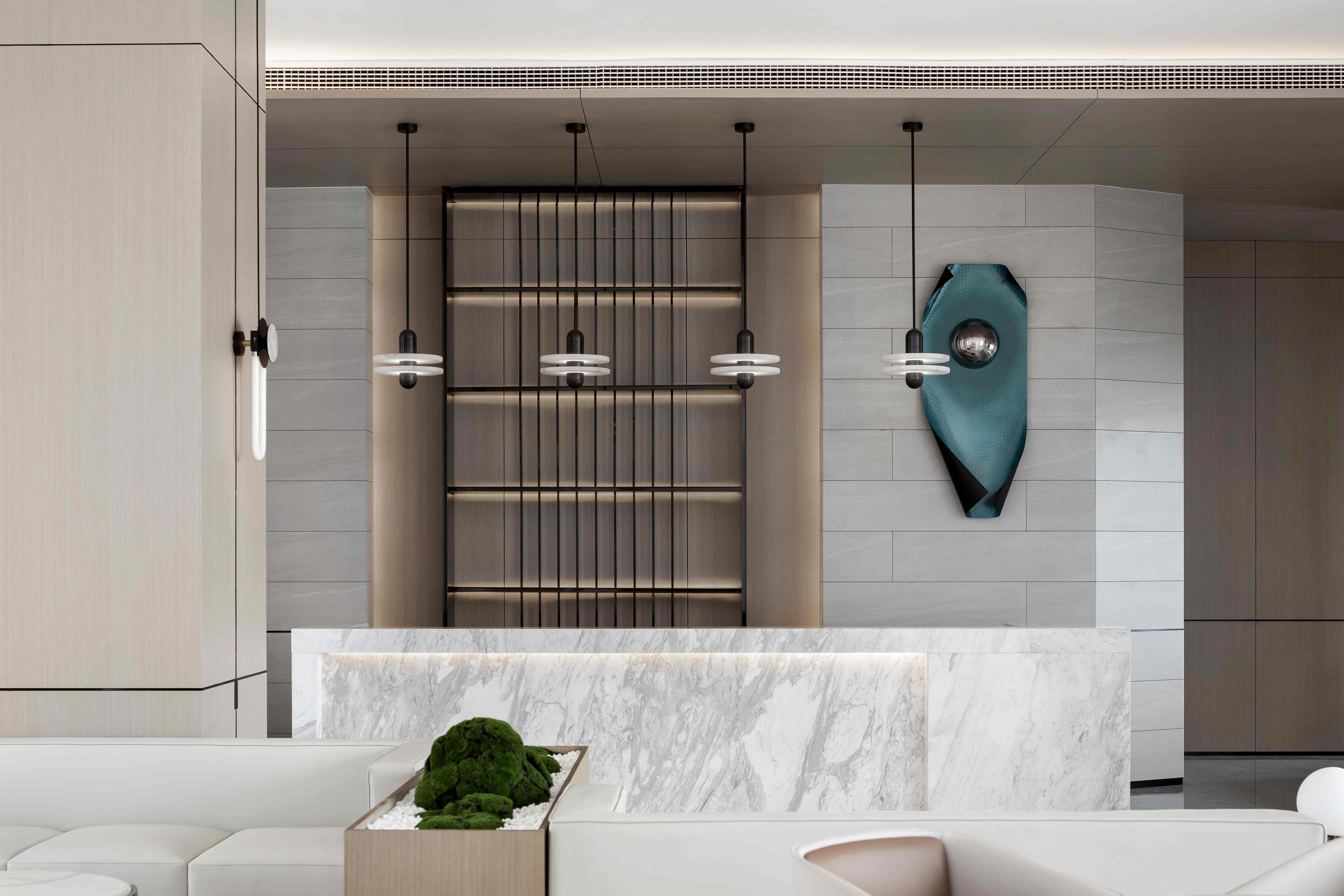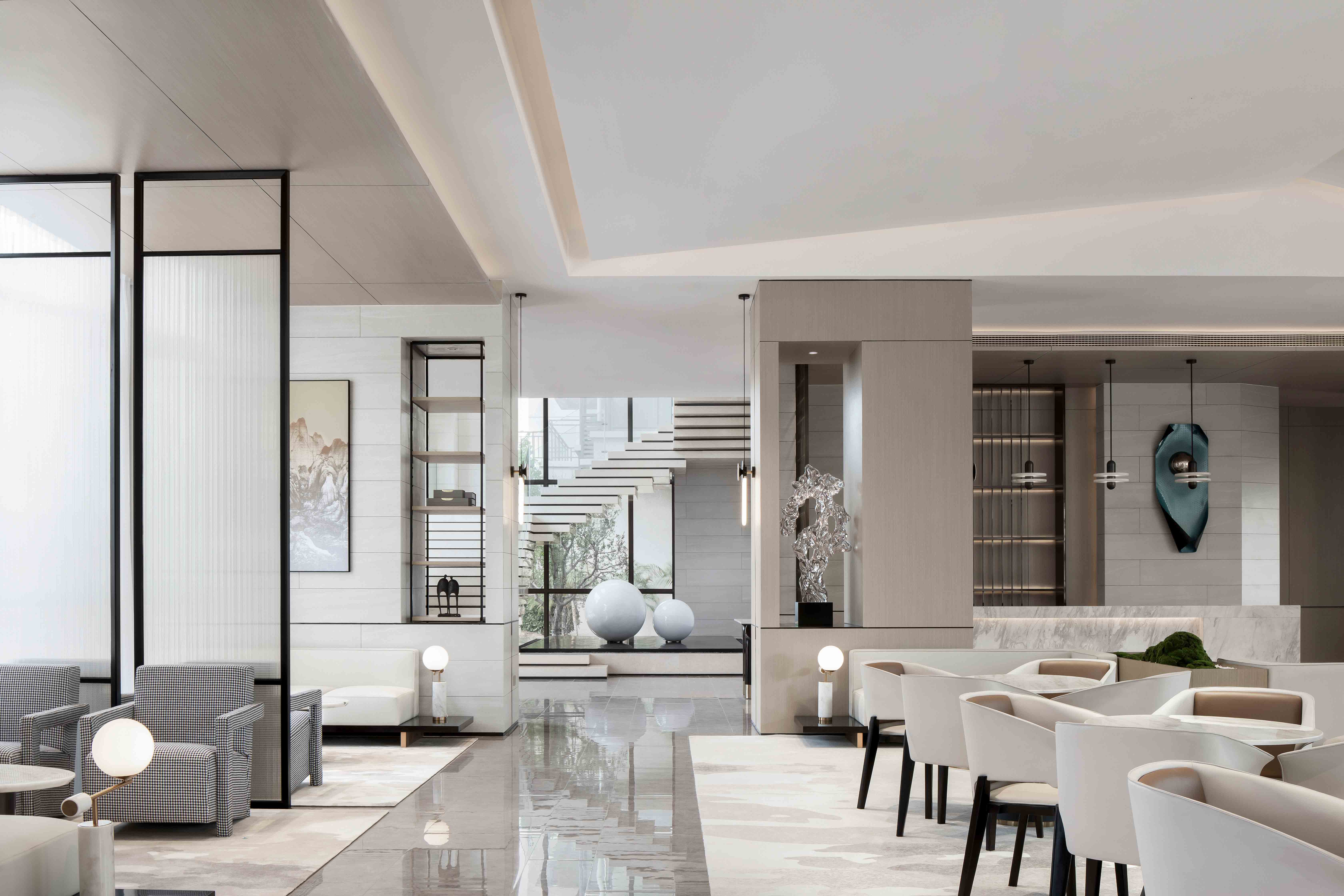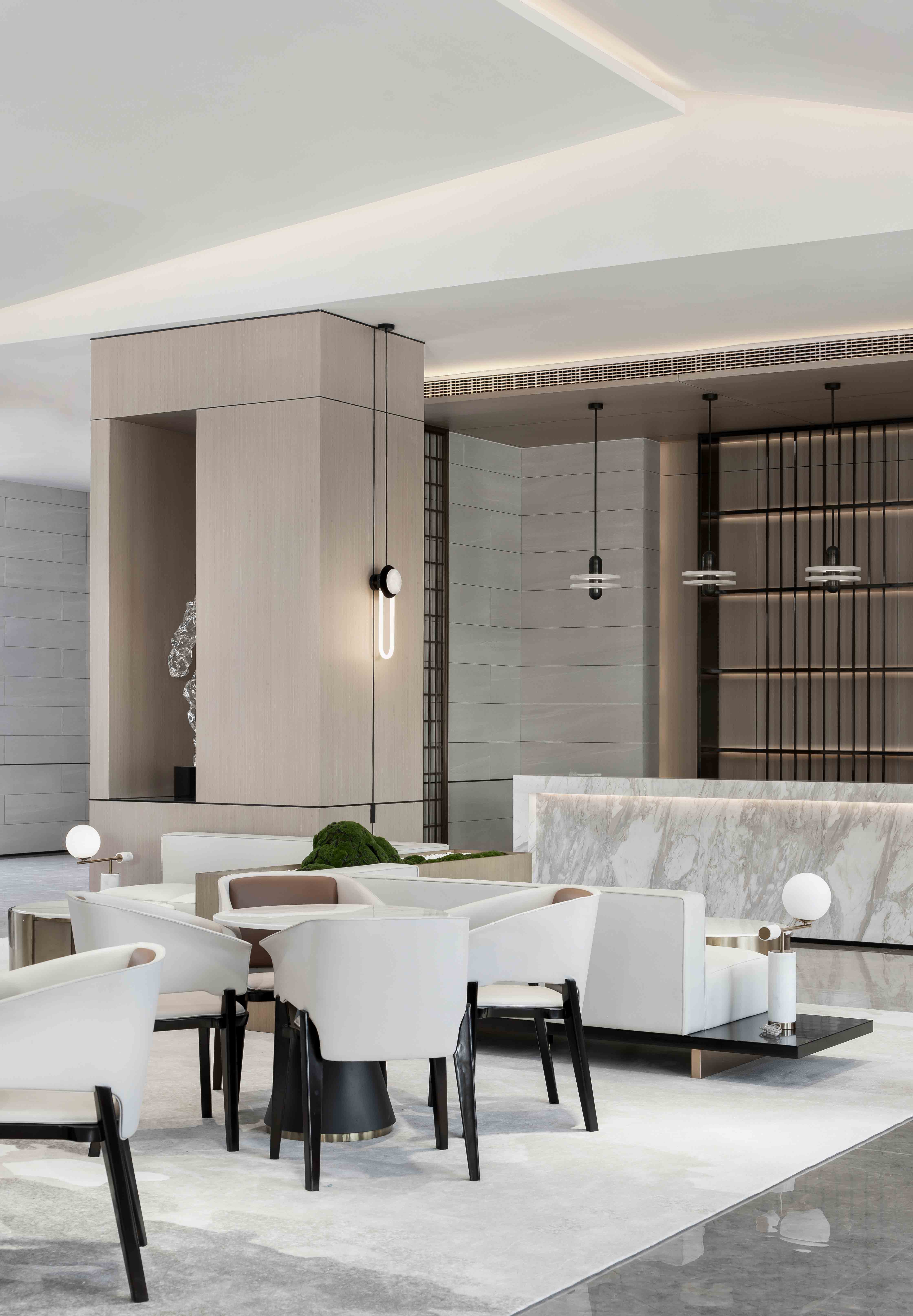 洽谈区天花的坡面将不平衡动态观感极致呈现,以现代方式重构传统秩序美。